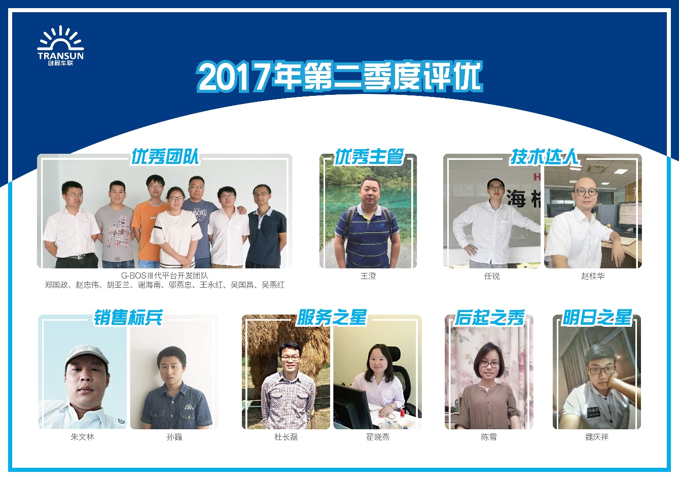 7月31號(hào),第二季度優(yōu)秀員工評(píng)選活動(dòng)已圓滿落下帷幕,經(jīng)過(guò)一輪輪的篩選,一批優(yōu)秀員工登上了光榮榜:優(yōu)秀團(tuán)隊(duì)G-BOSⅢ代平臺(tái)開發(fā)團(tuán)隊(duì)、優(yōu)秀主管王澄、技術(shù)達(dá)人任銳和趙桂華、銷售標(biāo)兵朱文林和孫巍、服務(wù)之星杜長(zhǎng)磊和翟曉燕、后起之秀陳雪、明日之星魏慶祥,在此,我們一睹他們的風(fēng)采。