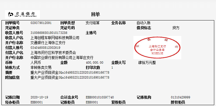 2020年8月,根據(jù)《閔行區(qū)關(guān)于推進(jìn)科技創(chuàng)新創(chuàng)業(yè)和成果轉(zhuǎn)化的政策意見》(閔府規(guī)發(fā)〔2019〕1號(hào))及操作細(xì)則,上海創(chuàng)程“基于5G技術(shù)的智能網(wǎng)聯(lián)公交系統(tǒng)”項(xiàng)目立項(xiàng)獲得成功,10月份,我司該項(xiàng)目已通過上海市閔行區(qū)科學(xué)技術(shù)委員會(huì)的驗(yàn)收,并獲得50%項(xiàng)目經(jīng)費(fèi),共40萬元,另一半項(xiàng)目經(jīng)費(fèi)預(yù)計(jì)明年撥付。
