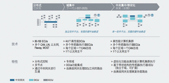 2015年,博世提出了眾所周知的電子電氣架構(gòu)技術(shù)路線圖, 并描繪了未來電子架構(gòu)的主要特征及可能的實現(xiàn)時間點。對于這一路線圖本身無需再做過多介紹,但其中的兩個重要標(biāo)志性節(jié)點依然值得強調(diào),即DCU或HPC的出現(xiàn),以及統(tǒng)一的基礎(chǔ)軟件平臺的出現(xiàn),標(biāo)志著EEA的本質(zhì)進(jìn)化。盡管由于車企的解決方案各不相同,其對EEA進(jìn)化的階段定義可能有所不同,但羅蘭貝格認(rèn)為EEA的發(fā)展整體會經(jīng)歷三大階段:分布式架構(gòu)、基于域的集中式架構(gòu)和基于域融合的帶狀架構(gòu),如圖4。