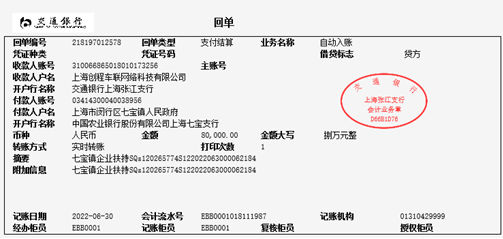2022年6月30日,我司收到上海市閔行區(qū)七寶鎮(zhèn)人民政府企業(yè)扶持專項(xiàng)首筆資金8萬元,預(yù)計下半年會獲得剩余尾款7萬元。