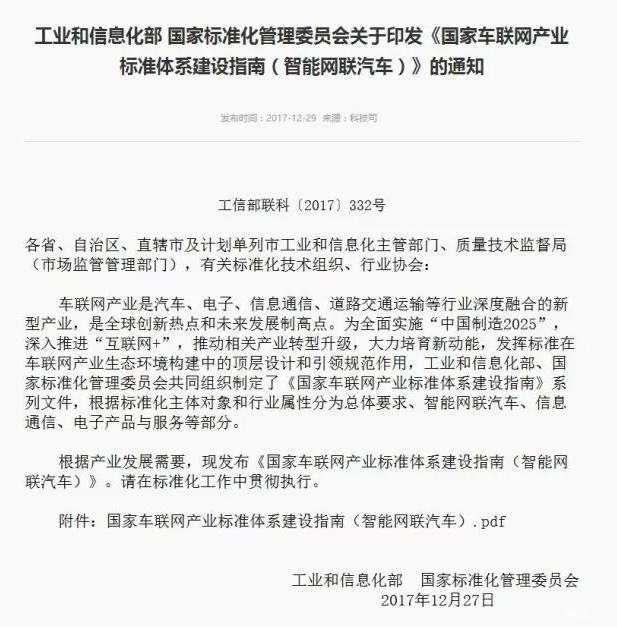 日前,工業(yè)和信息化部國(guó)家標(biāo)準(zhǔn)化管理委員向各省、自治區(qū)、直轄市及計(jì)劃單列市工業(yè)和信息化主管部門(mén)、質(zhì)量技術(shù)監(jiān)督局(市場(chǎng)監(jiān)管管理部門(mén)),有關(guān)標(biāo)準(zhǔn)化技術(shù)組織、行業(yè)協(xié)會(huì)下發(fā)了《國(guó)家車聯(lián)網(wǎng)產(chǎn)業(yè)標(biāo)準(zhǔn)體系建設(shè)指南(智能網(wǎng)聯(lián)汽車)》的通知。